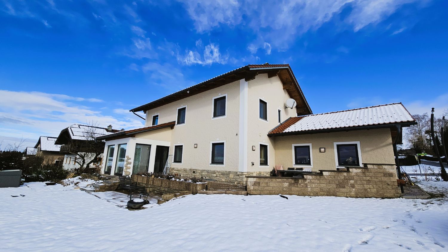 Virtuelle 360-Grad-Tour auf Anfrage verfügbar! Zum Verkauf steht ein gepflegtes und hochwertig ausgestattetes Einfamilienhaus in Moosdorf. Das im Jahr 2009 in Massivbauweise errichtete Wohnhaus überzeugt durch moderne Technik, großzügige Raumaufteilung und nachhaltige Energielösungen. Auf einer Wohnfläche von ca. 165 m² verteilen sich insgesamt 7 Zimmer, die vielseitige Nutzungsmöglichkeiten bieten – ideal für Familien, Homeoffice oder Gästezimmer. Darüber hinaus ist die Liegenschaft vollständig unterkellert und verfügt dabei über 3 beheizte Kellerräume. Das sonnige Grundstück mit ca. 844 m² bietet ausreichend Platz für Gartenliebhaber, Spielbereiche oder individuelle Gestaltungsideen. Ein besonderes Highlight ist die ca. 23 m² große Terrasse, die zu entspannten Stunden im Freien einlädt. Zusätzlich erweitert ein Wintergarten den Wohnraum und schafft eine angenehme Verbindung zwischen Innen- und Außenbereich. Ausstattung & Highlights BUS-System für moderne Haussteuerung Garage mit Wallbox für E-Mobilität Wintergarten - 5,4 kWp Photovoltaikanlage Solaranlage Effiziente Erdwärmeheizung 3 beheizte Kellerräume Terrasse mit ca. 23m² - Vorbereitung für Klimaanlage Die Kombination aus Erdwärmeheizung, Photovoltaik und Solaranlage sorgt für energieeffizientes und nachhaltiges Wohnen mit niedrigen Betriebskosten. Dieses Einfamilienhaus vereint großzügiges Wohnen, moderne Technik und nachhaltige Energieversorgung auf einem attraktiven Grundstück. Ideal für Familien oder Käufer, die Wert auf Qualität, Komfort und Zukunftssicherheit legen. Gerne stellen wir Ihnen dieses besondere Objekt bei einer Besichtigung persönlich vor.